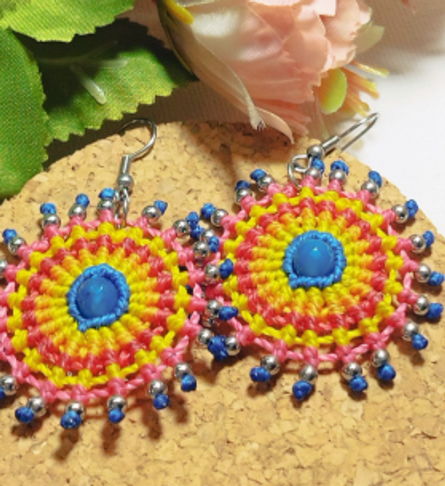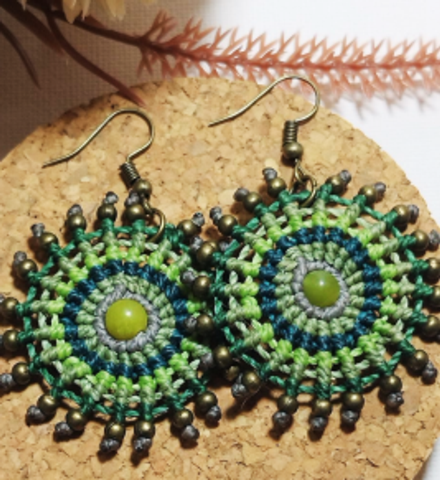 Nos tons verdes e cinza, feito com fio encerado , ganchos em aço cirúrgico, pedra natural e bolas em latão.